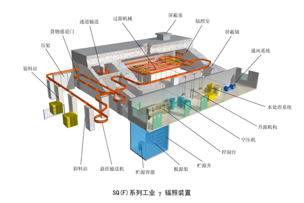 - 輸送系統:采用懸挂輸送與氣動過源機械相結合,能密集、多路多工位運行,可采用源超蓋或者産品超蓋的運行模式,適合綜合性多品種輻照