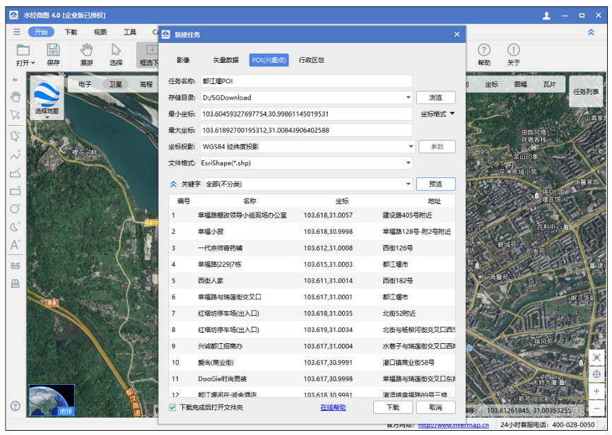 Vector Points of Interest (POI) data can be downloaded, such as: hotels, restaurants, catering, public facilities, administrative landmarks, gas stations, transportation stations, financial and securities institutions, scientific research and educational institutions, tourist attractions, enterprises and institutions, place names, shopping malls and supermarkets, office buildings, leisure and entertainment venues, postal and telecommunications services, ATM locations, and base station sites, etc.