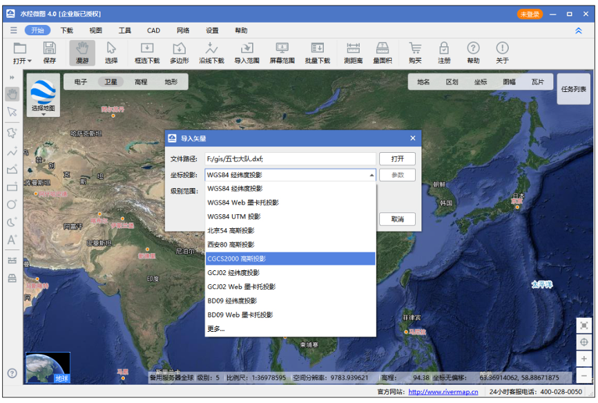 Supports importing and exporting vector data in multiple projections, including WGS84 Geographic (Lat/Lon), WGS84 Web Mercator, Beijing 54 Gauss-Kruger, Xi'an 80 Gauss-Kruger, CGCS2000 Gauss-Kruger, GCJ02 Geographic (Lat/Lon), GCJ02 Web Mercator, BD09 Geographic (Lat/Lon), and BD09 Web Mercator, etc.