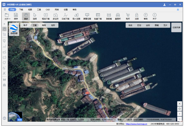 The maximum image resolution can reach 0.25 meters, making even ships by the river clearly visible, as shown below.