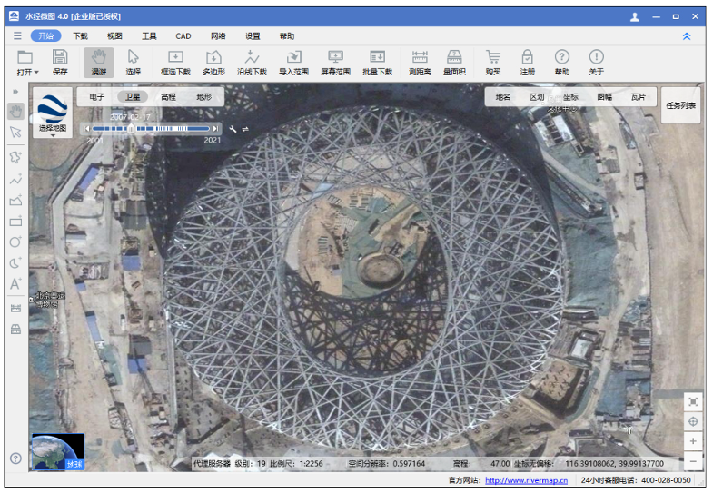 Selecting "Historical Imagery" allows viewing historical imagery maps of the Earth. The historical image from February 17, 2007, showing the world-renowned Bird's Nest construction progress, is shown below.