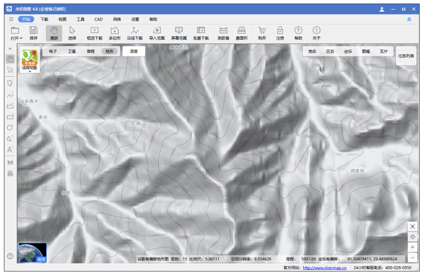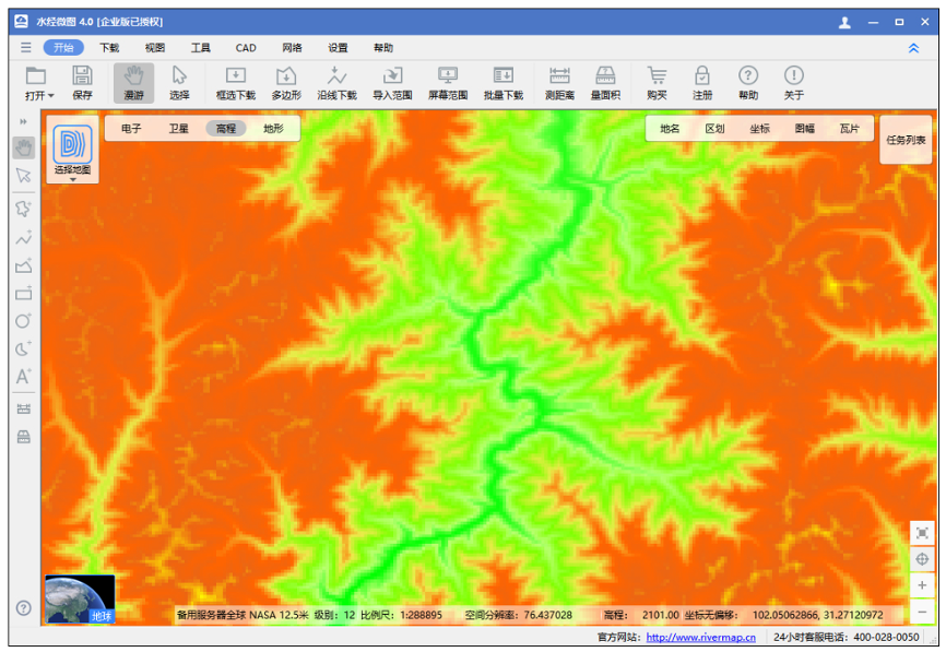 Elevation renderings can be viewed online. The downloaded elevation data can be opened in professional software to generate professional renderings, extract contours, or perform slope analysis, as shown below.
