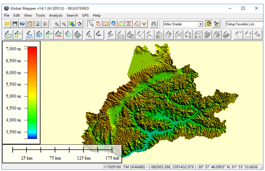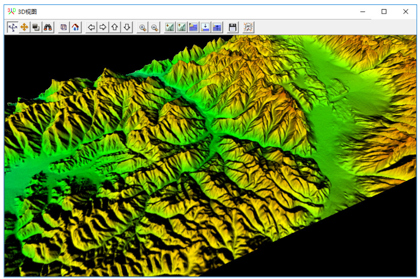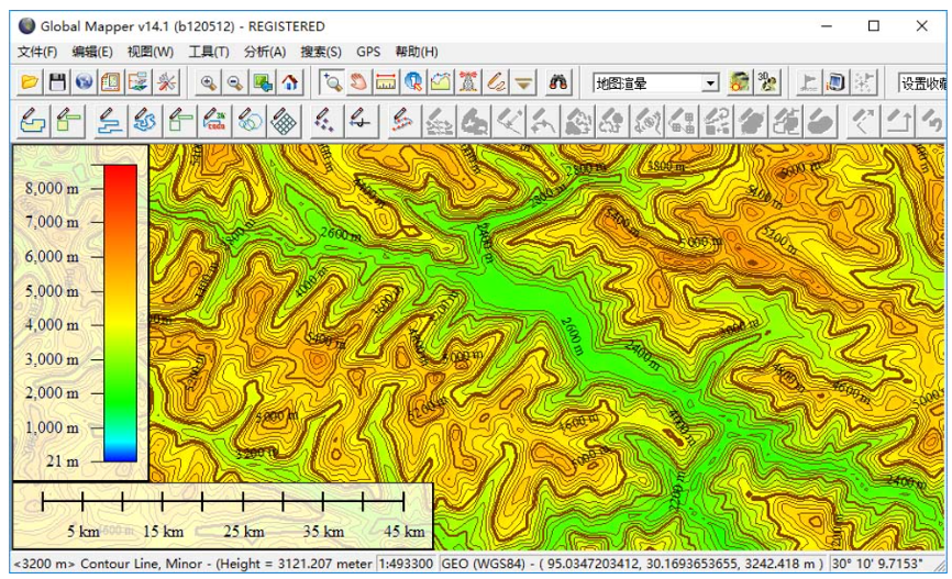 The downloaded elevation data can directly generate 3D terrain in Global Mapper, as shown below.