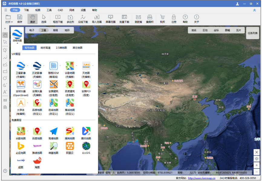 The detailed functions of "WeMap" primarily include: vector map drawing, vector data cloud synchronization, download of high-definition satellite imagery, viewing image capture dates, download of high-definition historical imagery, download of 12.5-meter elevation data, extraction of elevation contours, download of vector Points of Interest (POI), download of global vector road networks, download of nationwide building footprints, image and vector projection conversion, export of unrestricted large images (can be exported in blocks), export of tiles (with reprojection), export of map offline packages, vector point annotation, vector path drawing, vector polygonal outline drawing, download of national standard sheet maps, instant viewing of download results, download of terrain rendering maps, download of 10-meter contour raster maps, access to rich and diverse map resources, online viewing of virtual 3D terrain, perfect overlay of vector data and imagery in CAD, perfect overlay of vector data and imagery in ArcMap, support for image data clipping and background transparency, support for elevation data clipping and background transparency, and other powerful features. These will be explained separately below.