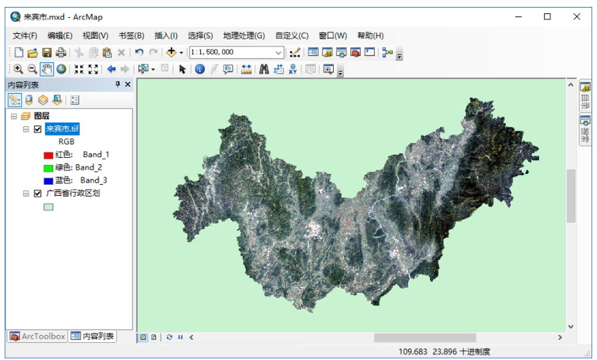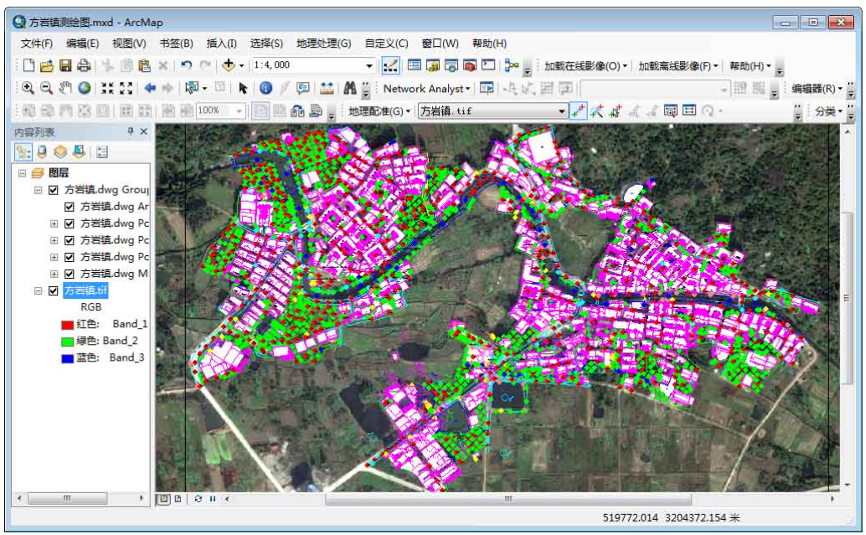 After projection conversion, the downloaded imagery data can perfectly overlay with vector data in the Xi'an 80 coordinate system, as shown below.