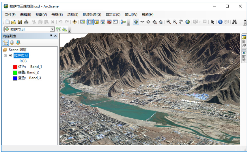After downloading satellite imagery and elevation data, offline 3D scenes can be built in ArcScene, as shown below.
