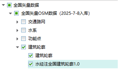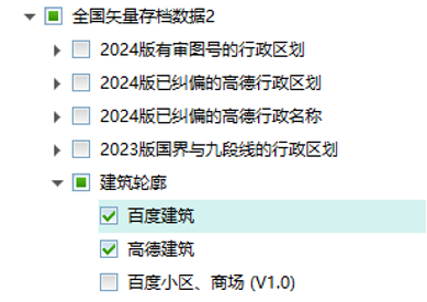 16. In the Database area of the user interface, check the following databases (Shuijingzhu National Building Outline 1.0, Baidu Buildings, Gaode Buildings).