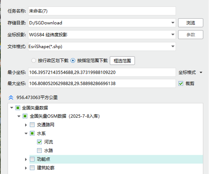 19. Enter the "New Task" window again, select "Vector Data", this time choose "Water System", and check "Rivers" to prepare for exporting river data.